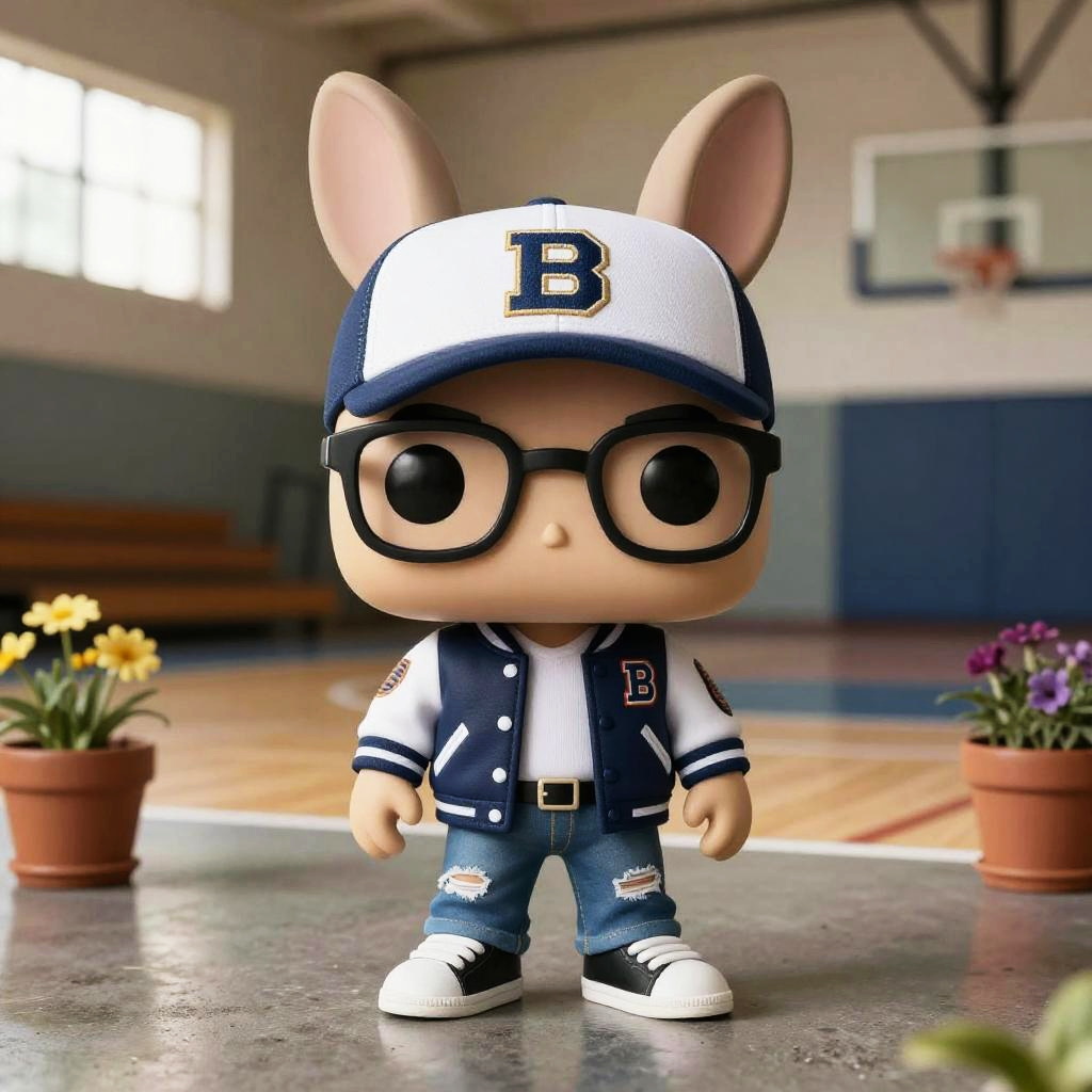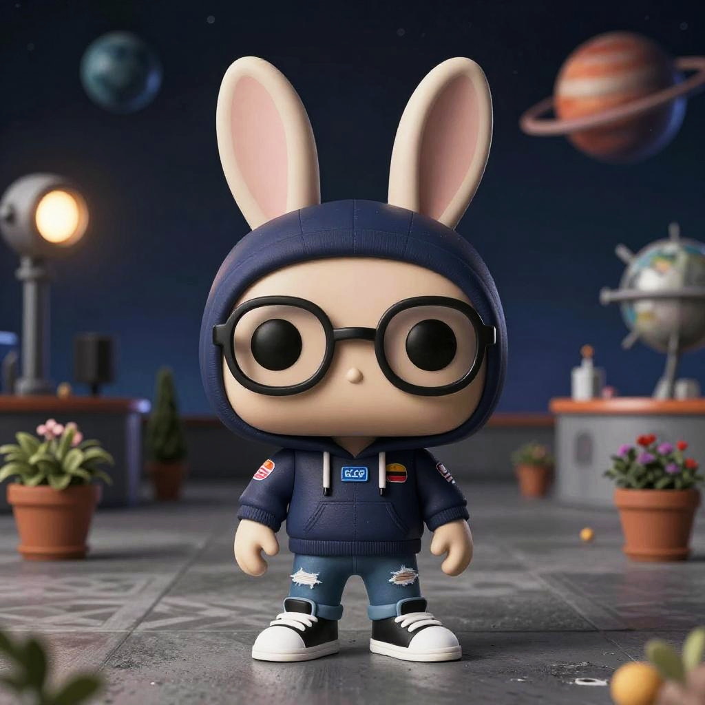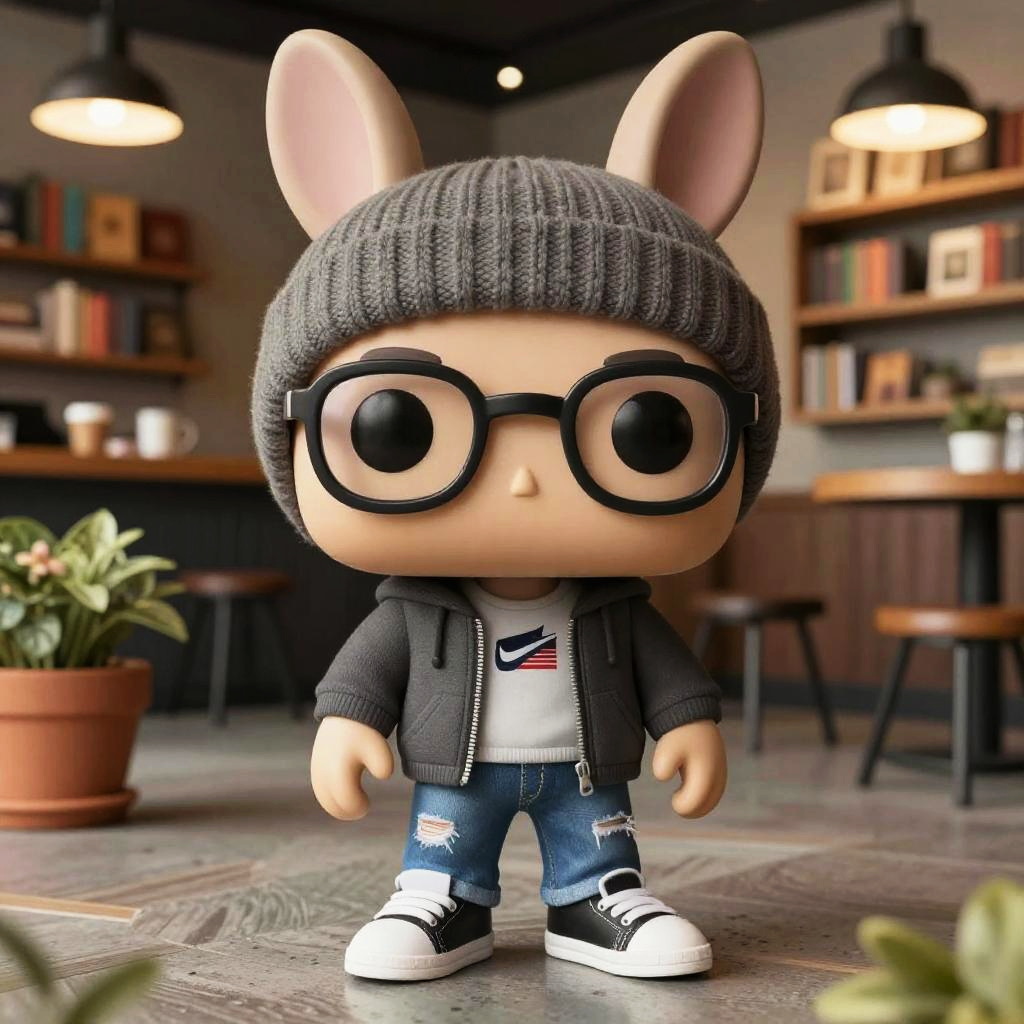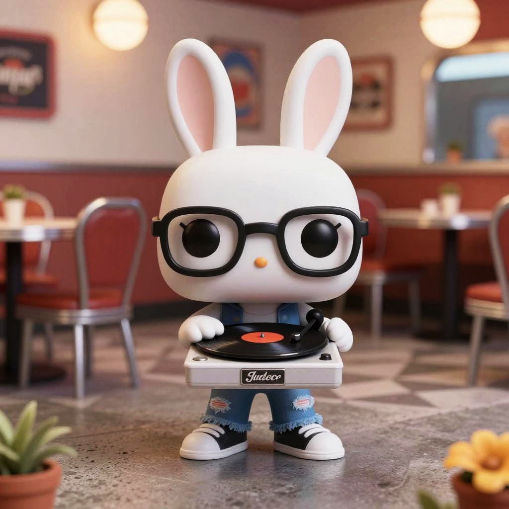 Funko Pop bunny dressed in a raincoat with an umbrella, with glasses, ripped jeans, sports shoes, in a rainy urban sidewalk, cinematic lighting, parquet concrete floors with flower pots, ultra-realistic editorial style.