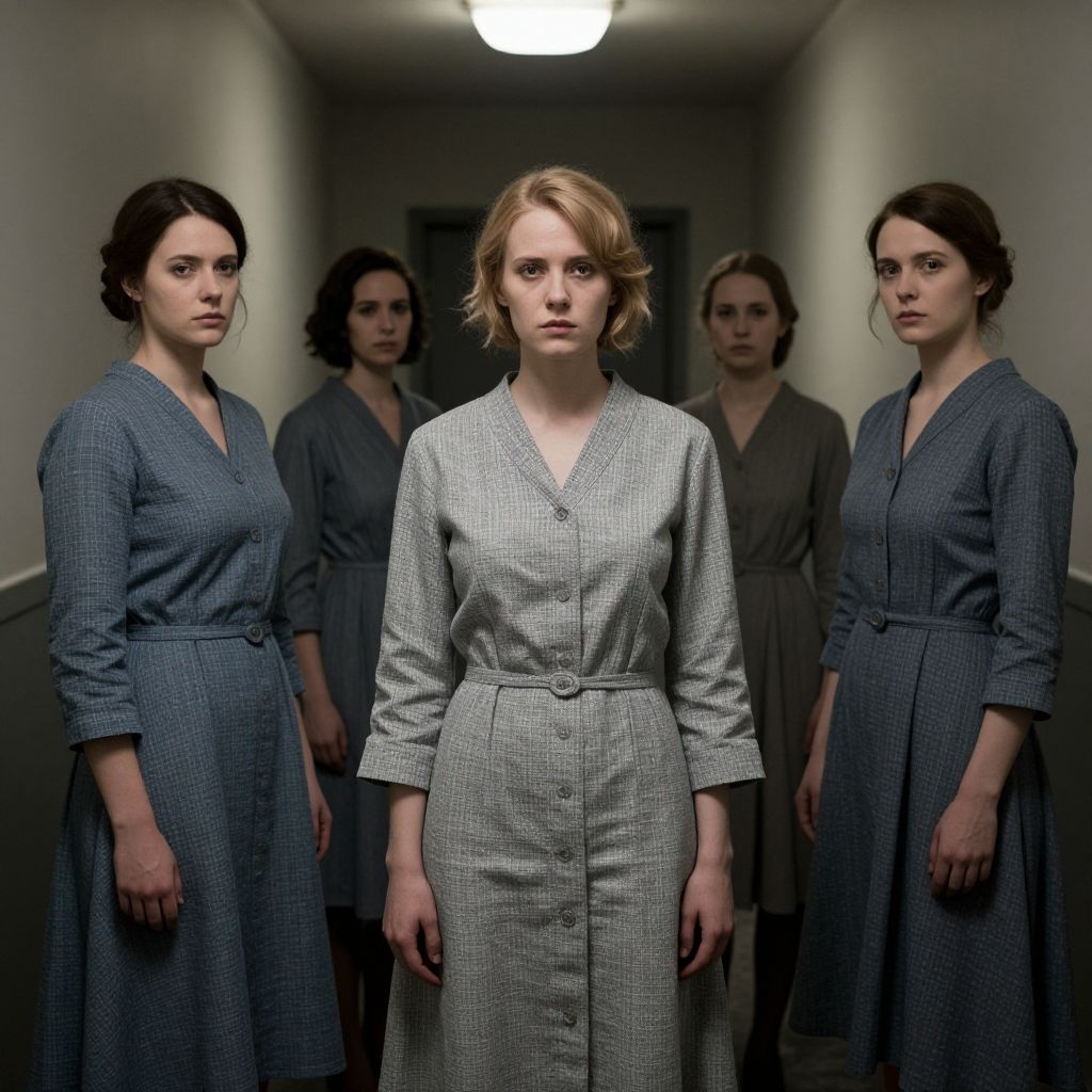 Photograph in a cinematic style featuring a narrow, dimly lit hallway with a central, illuminated light fixture. At the forefront stands a young woman with fair skin and short, blonde, wavy hair, wearing a grey, buttoned, long-sleeved dress with a checkered pattern. She has a serious, determined expression. Flanking her are four other women with dark hair, wearing matching blue, long-sleeved dresses with a similar checkered pattern. They stand in a slightly blurred background, creating a sense of depth. The women's expressions are solemn and focused, adding a sense of tension to the scene. The hallway walls are plain and grey.