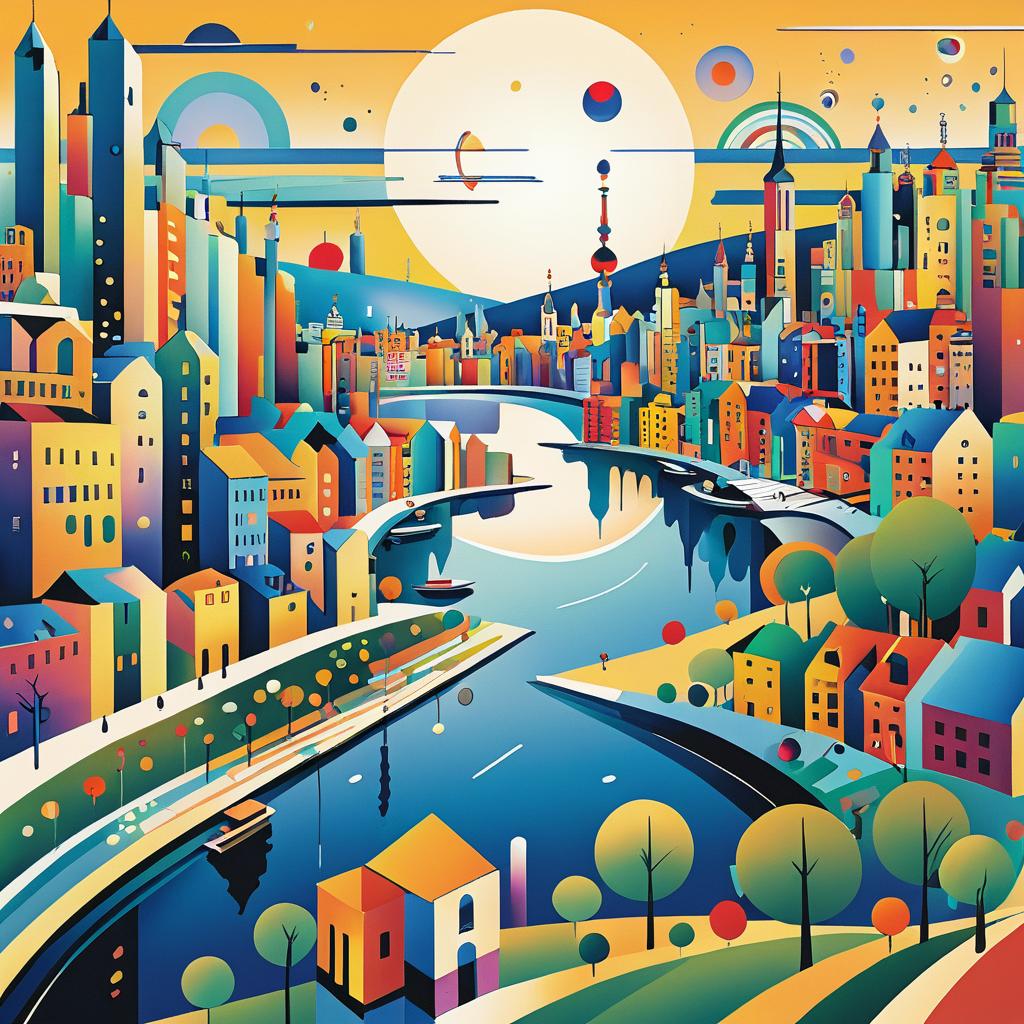 Detailed illustration of a bustling cityscape by Wassily Kandinsky, showcasing a serene landscape.