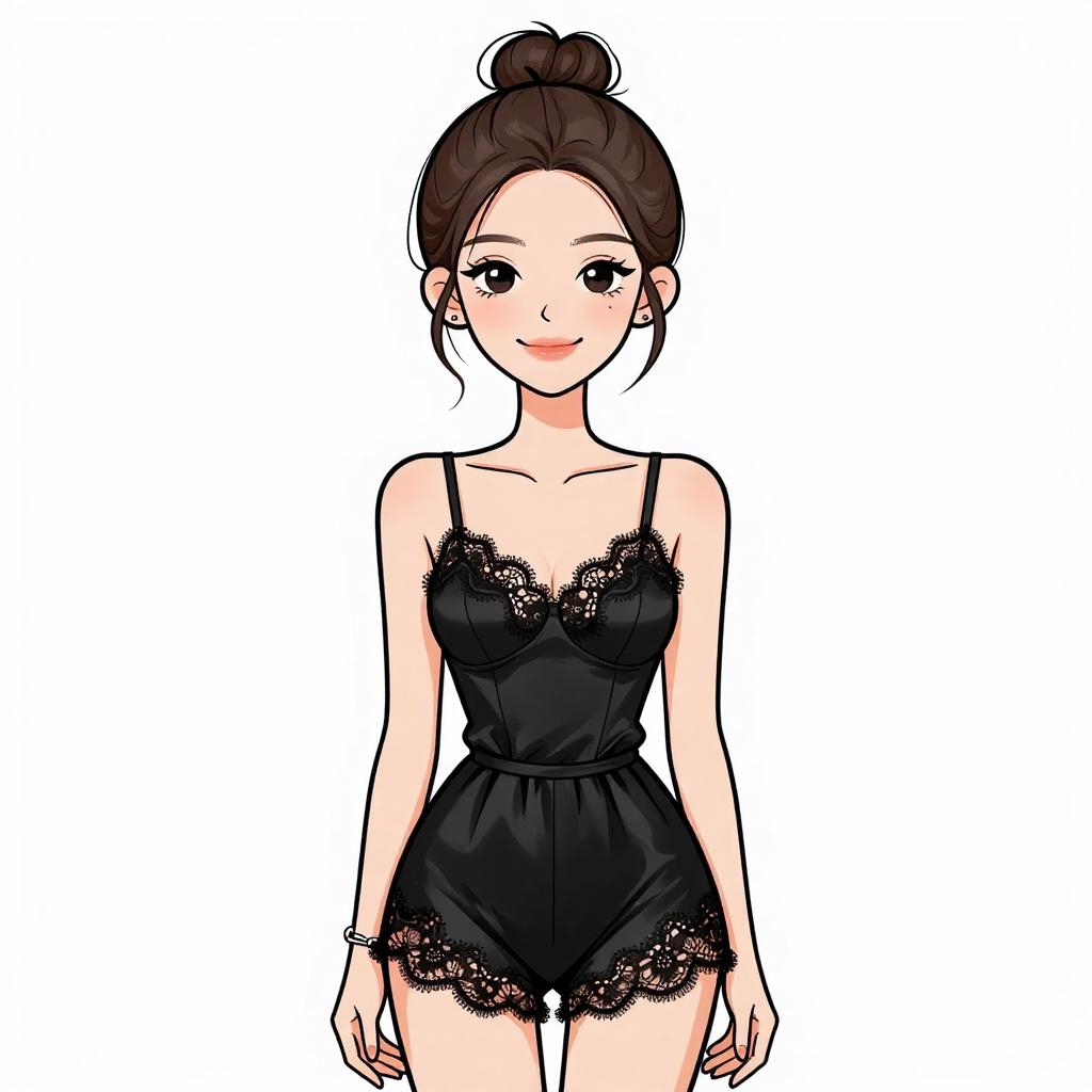 Woman with pretty face and pretty hair. smiling Woman, casual chic, black mini skater dress, lace bodice, sheer lace waist panel, spaghetti straps, skater skirt silhouette, light gold bracelet, white studio background --sref 1467