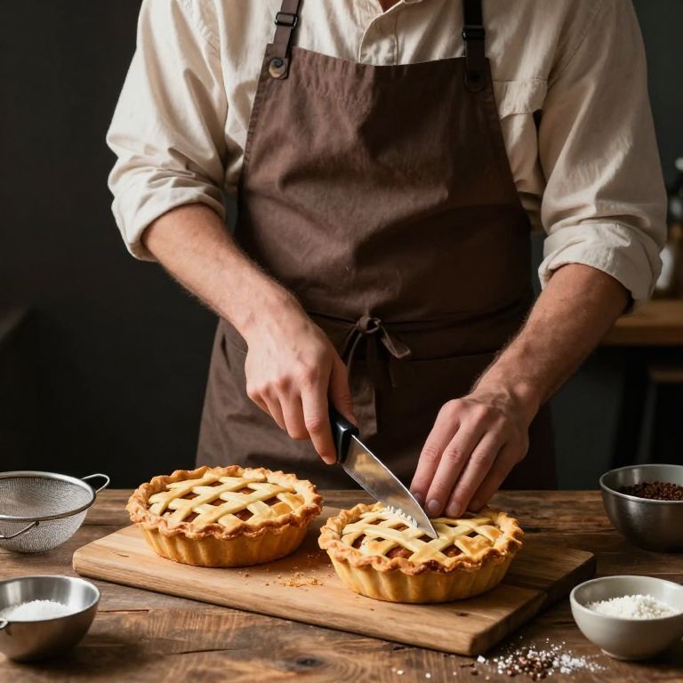 Culinary wizard, donned in a tall beige hat and brown apron, meticulously slices two golden lattice-top pies on a rustic wooden table, surrounded by baking tools and ingredients, while a silver sifter and small bowl rest nearby.