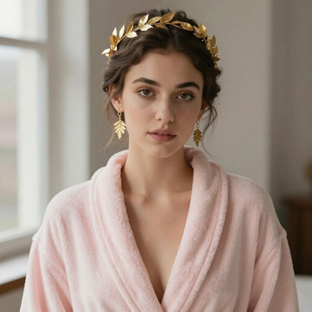 Photograph of a beautiful young woman with fair skin, brown eyes, and dark brown hair in an updo with a gold leaf headpiece. She's wearing a pink, plush bathrobe that's open, revealing her large, cleavage. She has delicate gold leaf-shaped earrings and subtle makeup with a natural look. The background is softly blurred, featuring neutral colors and a window.