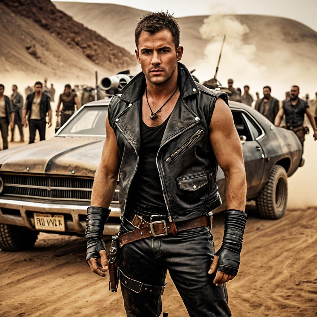 Photorealistic image of a muscular man with short brown hair and an intense expression, dressed in a black sleeveless leather vest and matching leather pants, accessorized with black wristbands and a brown belt with a large buckle. He stands confidently in front of a rugged, dusty vehicle with a steampunk style exhaust, set in a dusty desert environment with hills in the background. A blurred group of people and dust clouds add to the post-apocalyptic, action movie atmosphere.