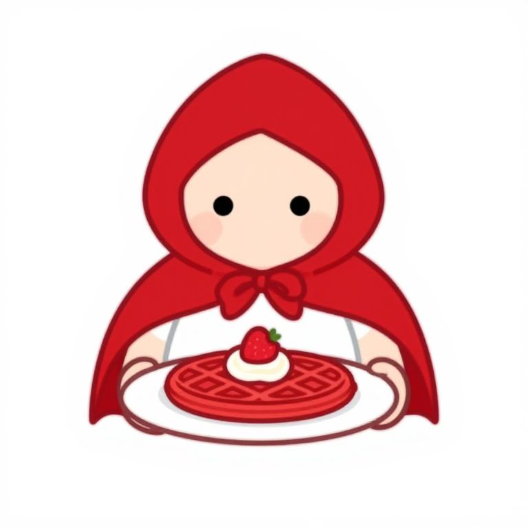 Chibi-style drawing of Little Red Riding Hood with a red hood, black eyes, and a white shirt, holding a plate with a waffle,