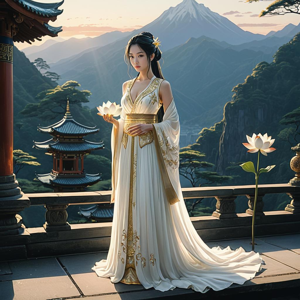 A serene goddess, holding a radiant lotus blossom, wearing a flowing white silk gown embellished with gold embroidery, set in a tranquil mountain temple at dawn, drawn in the soft and fantastical anime style of Kosuke Fujishima.