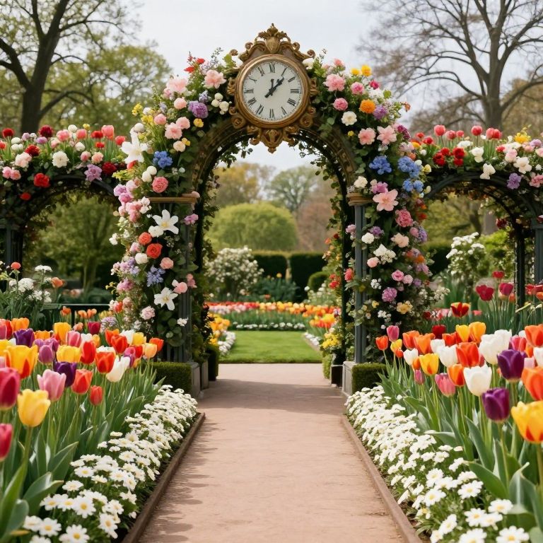 Photograph of a vibrant garden archway adorned with colorful flowers, surrounding a clock, flanked by tulips and daffodils, leading to