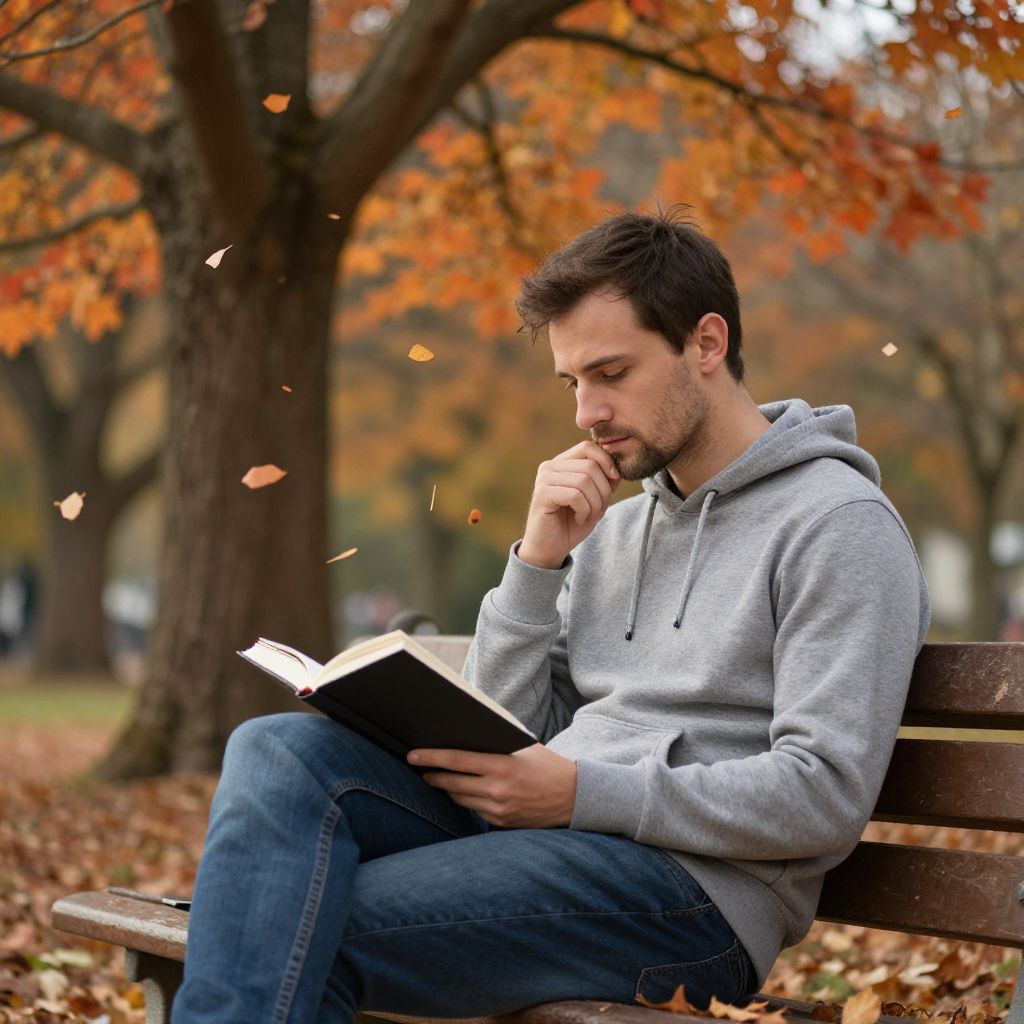 Prompt for man photo: A thoughtful man in a casual hoodie sits on a公园 bench, reading a book under a tree in autumn, warm orange and red leaves falling around him, soft natural light, serene atmosphere, authentic lifestyle photography, detailed textures, flux style.