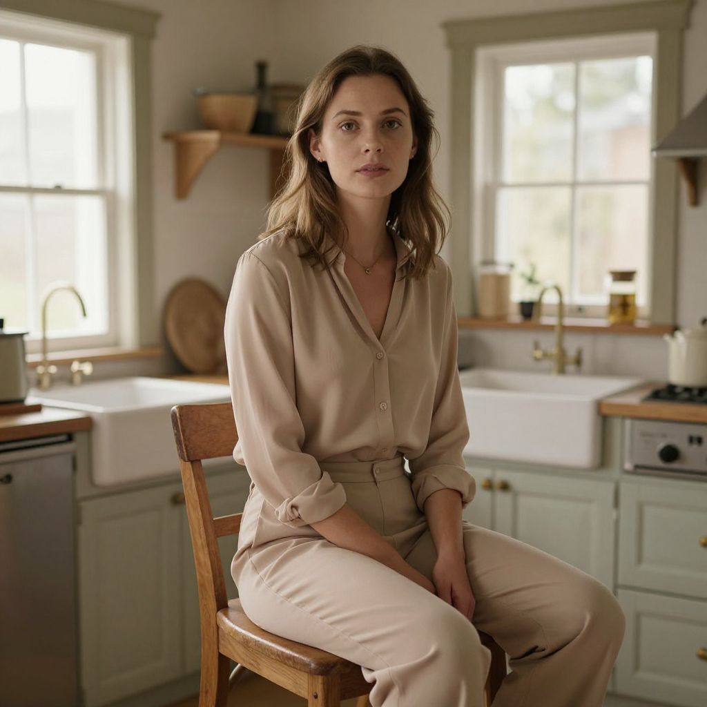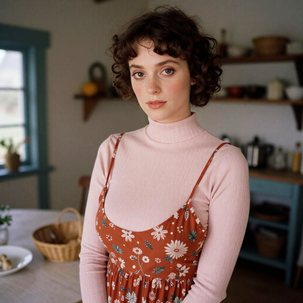 Photograph of a young woman with curly brown hair, wearing a pink turtleneck and brown floral dress, standing in a cozy kitchen.
