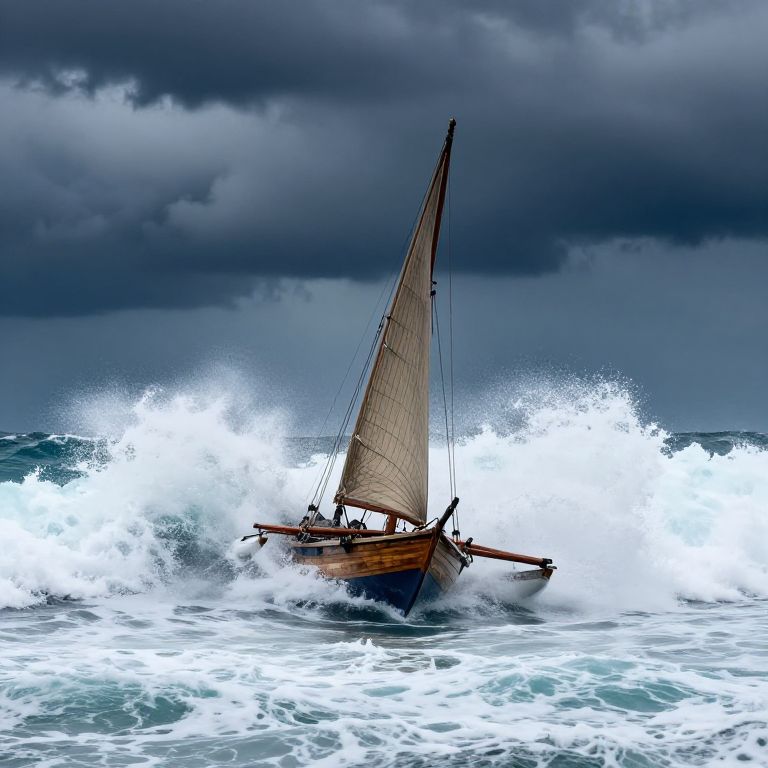 Historic proa with dual hulls sailing under dramatic stormy skies, intense ocean waves crashing, dynamic action scene, realistic water effects, vivid color contrasts between dark clouds and wooden boat, epic maritime imagery