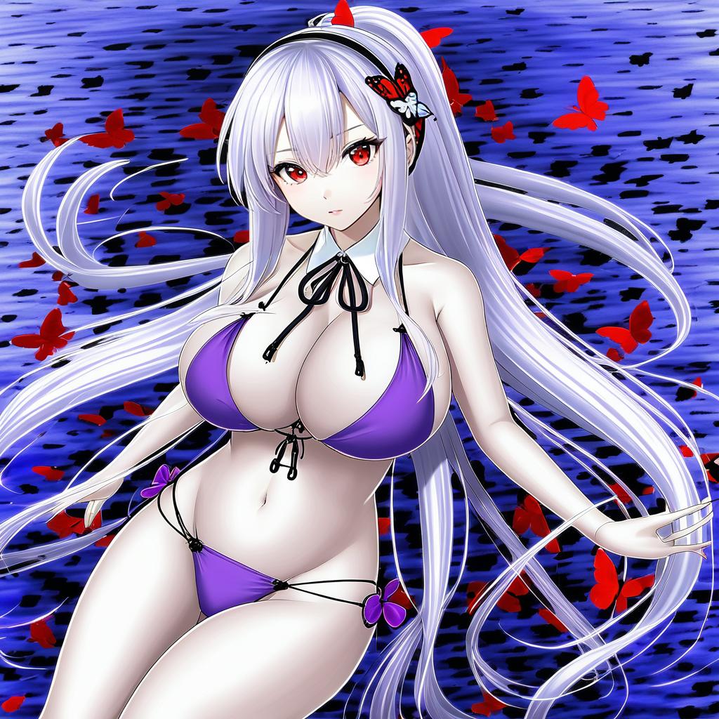 A digital illustration of an anime-style female character from Azur Lane, featuring long silver hair styled in a high ponytail with sidelocks, vibrant red eyes, and a butterfly hair ornament. She is wearing a revealing purple bikini with black string details, accentuating her cleavage and navel, posed against a blue background with floating red butterflies.