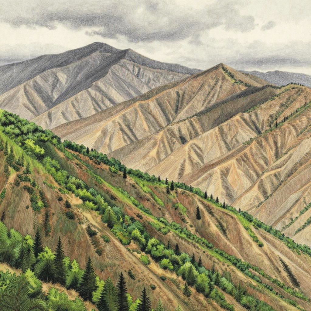 Colorful mountain landscape with green forested slopes in the foreground, transitioning to brown, rugged hills and peaks under a cloudy sky. Digital art.
