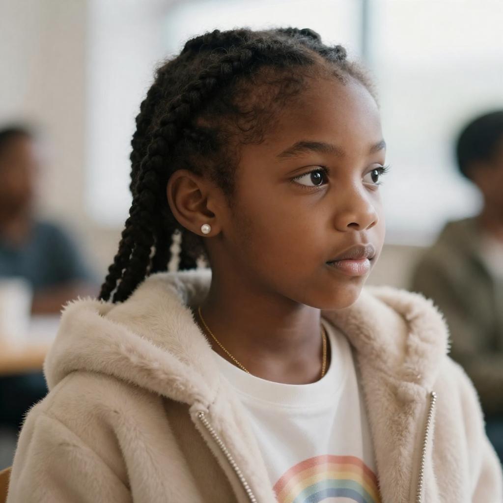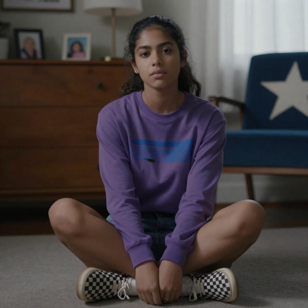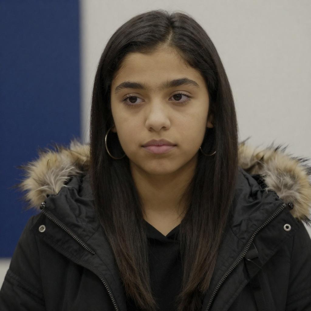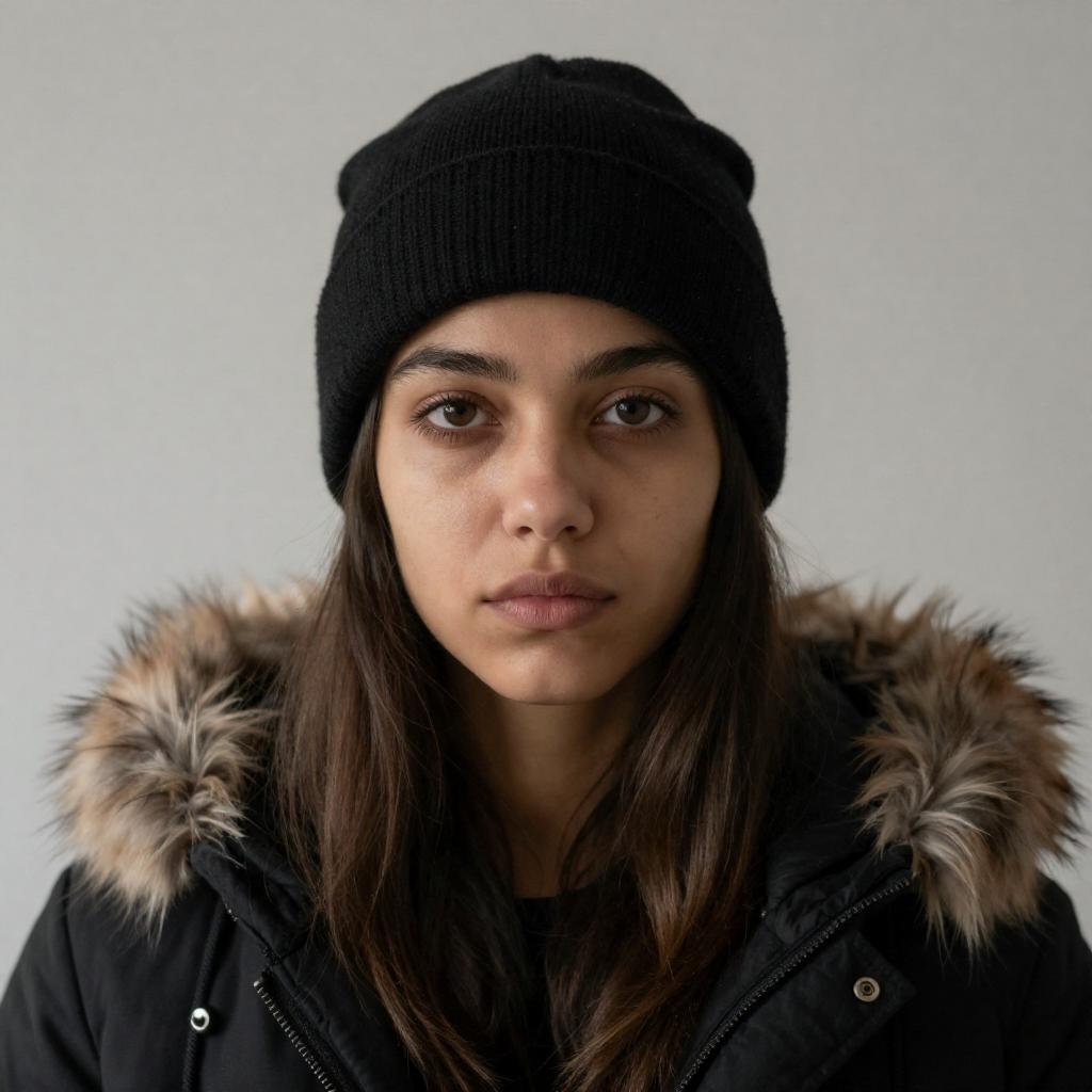 Portrait of a young Latina woman with straight dark brown hair and light brown skin. She is wearing a black winter jacket with a fur-lined hood and large hoop earrings. The woman is looking to the side with a neutral expression against a blurred indoor background with blue and white tones.