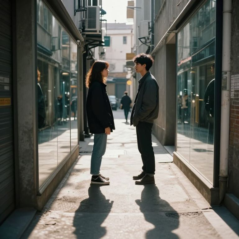 Two individuals stand in a narrow alley flanked by tall, reflective mirrors, their shadows cast sharply on the ground as they face each other amidst a surreal urban backdrop where their mirrored reflections appear to lead separate, vivid lives.
