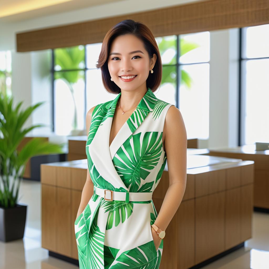 Portrait of a confident and stylish Asian female financial advisor wearing a white and green tropical leaf patterned sleeveless dress with a belt, standing in a modern office environment with natural daylight. The advisor has short brown hair, wears subtle makeup, pearl earrings, and a watch, projecting professionalism mixed with a casual, trendy vibe.