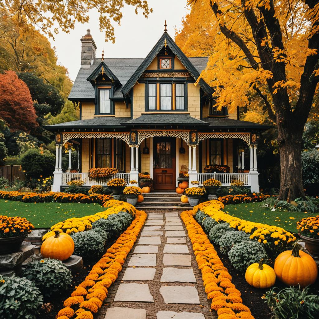 A charming Victorian-style cottage with intricate architectural details, embraced by warm, golden autumn trees, the front yard adorned with a display of ornamental gourds and marigolds, a winding stone pathway leading to the entrance, evokes a warm, cozy fall atmosphere with golden amber and warm browns
