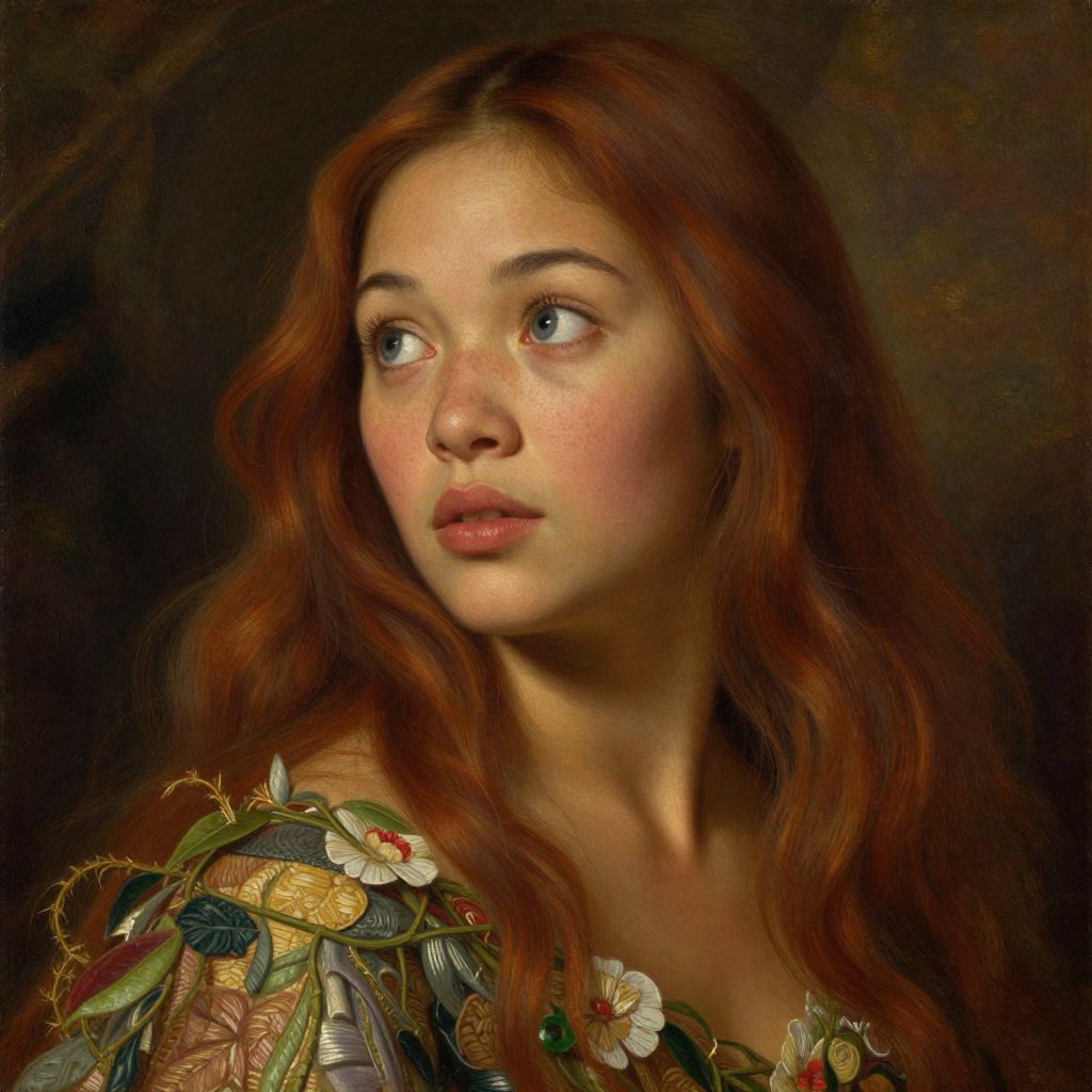 Digital portrait of a young woman with long, wavy auburn hair, fair skin, and blue eyes, wearing a floral-patterned garment,
