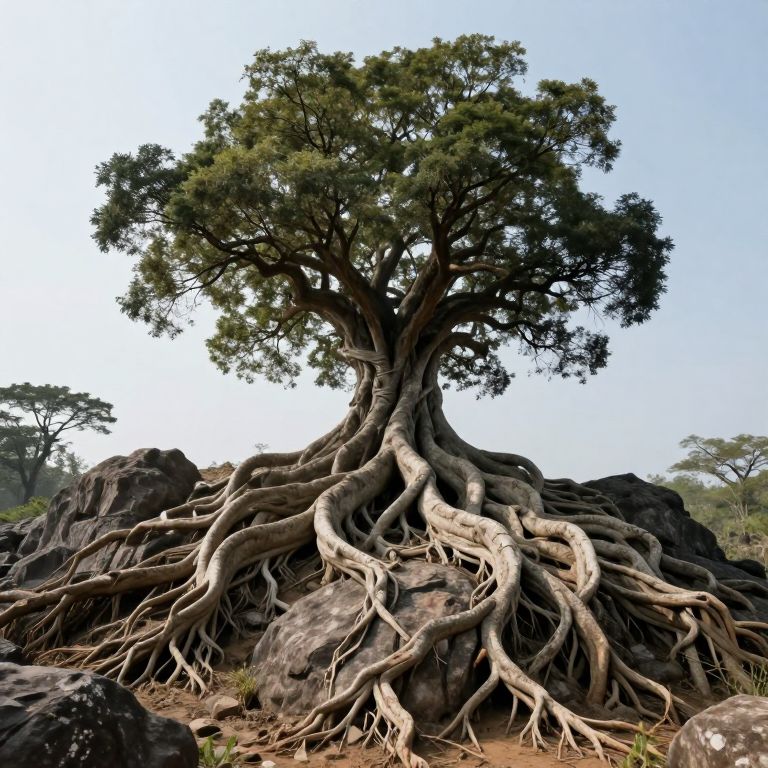Photograph of a large, ancient tree with thick, gnarled roots sprawling over dark, rocky terrain. The tree's dense, green foliage contrasts with the clear, pale blue sky. The intricate, twisting roots are prominently visible, wrapping around and between the rocks. In the background, smaller trees and a hint of greenery are visible. The image focuses on the tree's robust and weathered roots, highlighting nature's resilience and beauty. The overall scene suggests a rugged, natural landscape.