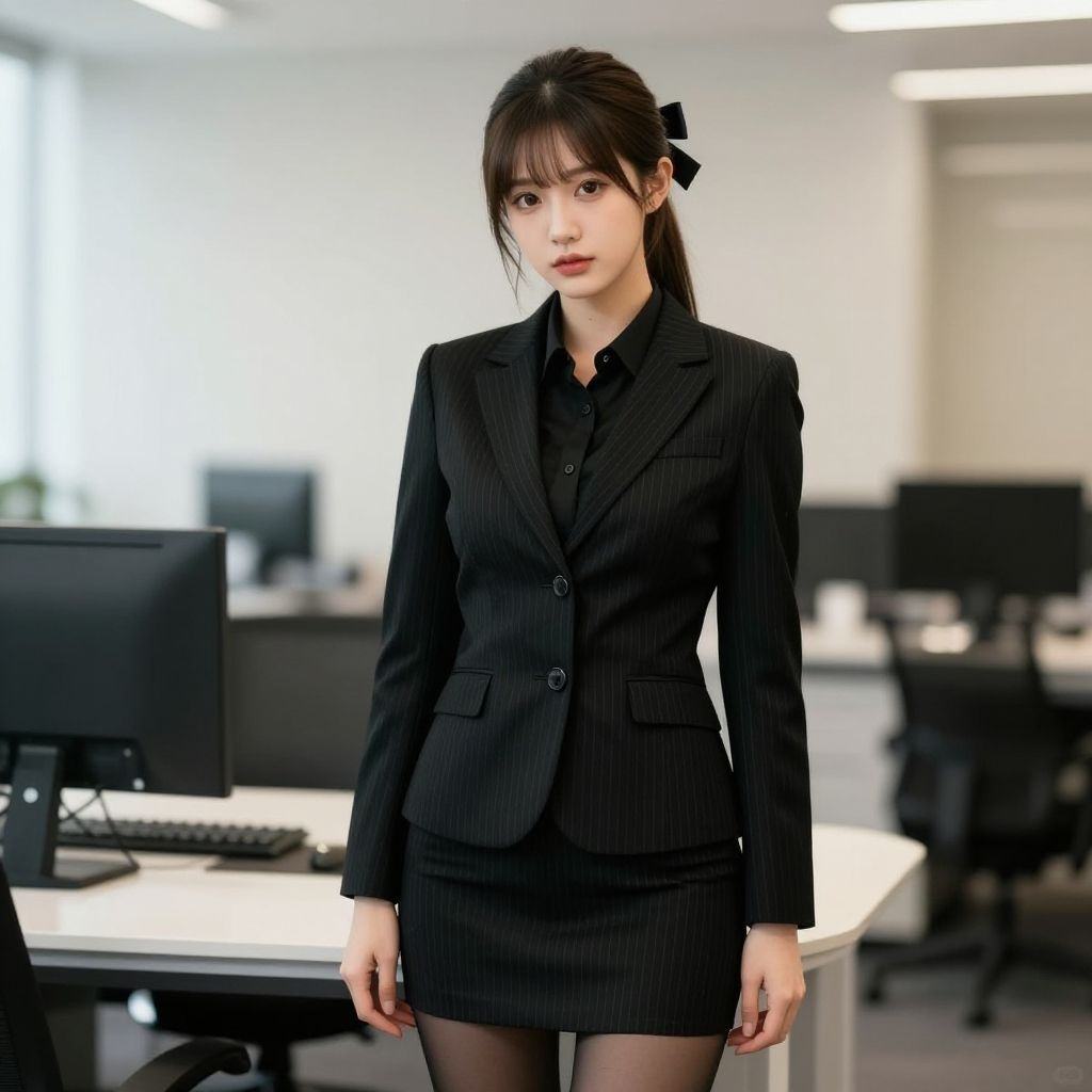 Digital anime-style drawing of a serious, attractive woman in a black pinstripe suit, white shirt, and black stockings, standing in a bright,