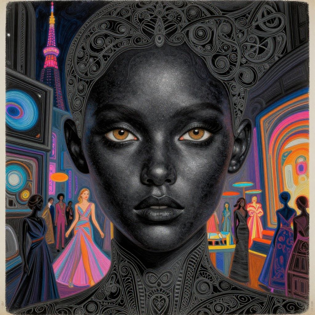 Digital artwork featuring a central, hyper-realistic black-skinned woman with intricate, ornate headpiece and golden eyes. The background is a vibrant, neon-lit scene with a mix of people in colorful, flowing dresses. A pink and blue-lit Eiffel Tower is on the left, and a brightly illuminated doorway is on the right. The people in the background are silhouetted in various hues of blue and purple, adding depth and contrast. The overall style is surreal, with a blend of realism and fantasy, using bold, contrasting colors and intricate details.