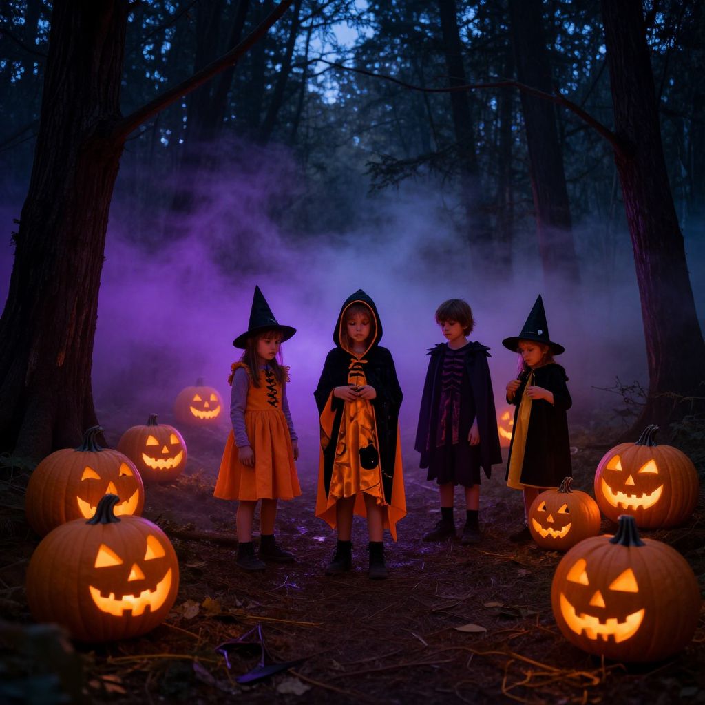 Hween celebration at twilight with glowing jack-o'-lanterns, eerie fog rolling through a haunted forest, children in creative costumes trick-or-treating, vibrant purples and oranges highlighting spooky yet festive atmosphere, detailed and immersive scene