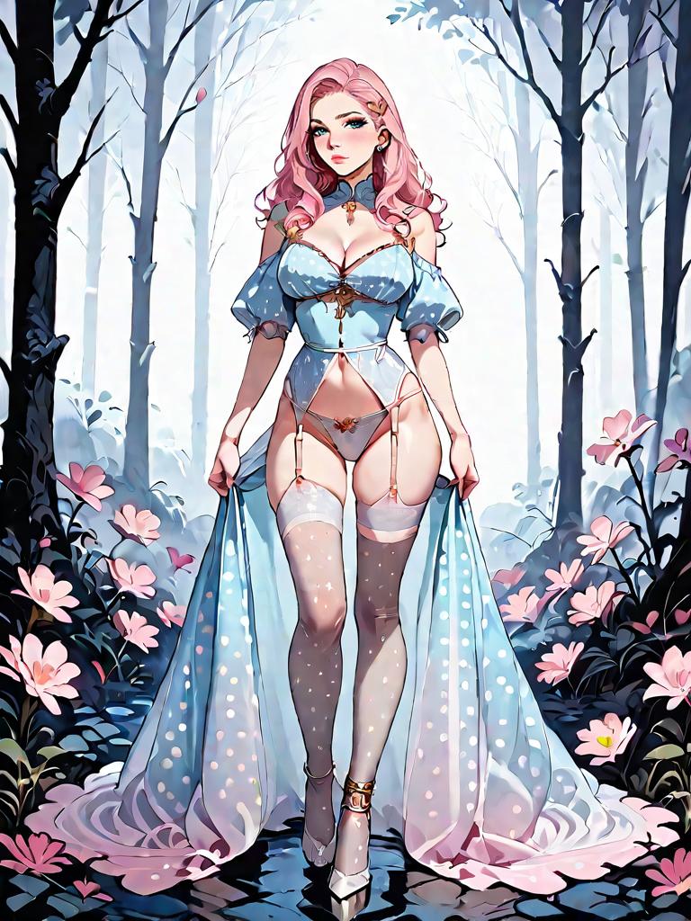 Full body, 1girl, dark_fantasy, medieval dark_forest, fog, torchlight, night mist ominous, comic Chic high-waisted garter belt, soft blush satin, intricate lace trim, matching balconette bra, underwire support, delicate floral appliqués, sheer mesh thong, light pink color, adjustable garter straps, gold clips, elegant silk stockings, polka dot pattern, playful yet sophisticated.