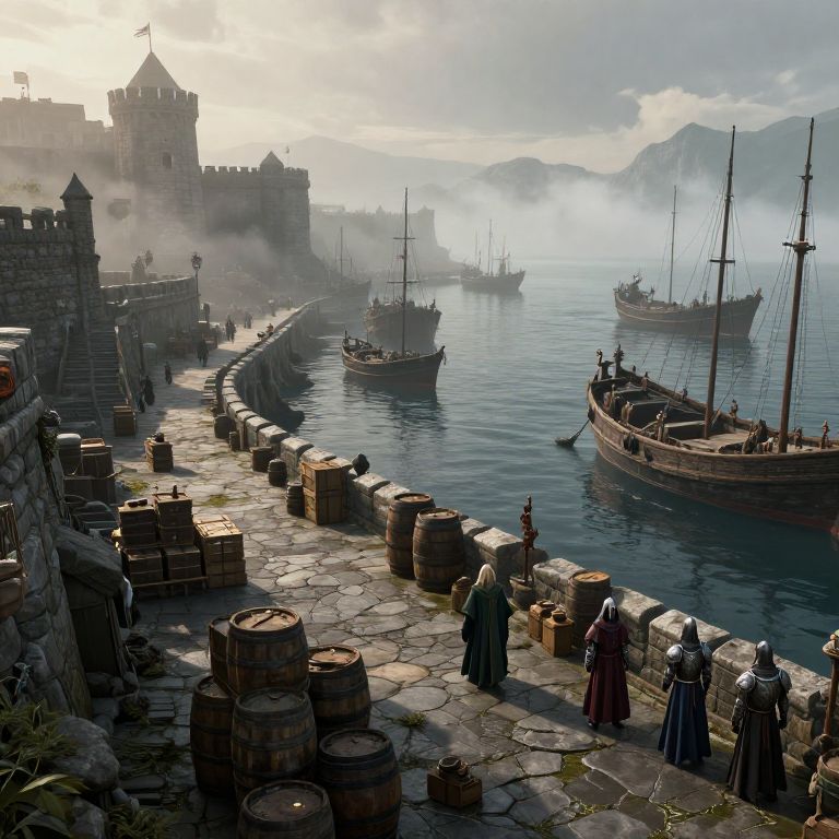 Digital painting of a misty medieval harbor with stone castle, wooden barrels, three sailboats, and cloaked figures on a cobblestone dock.