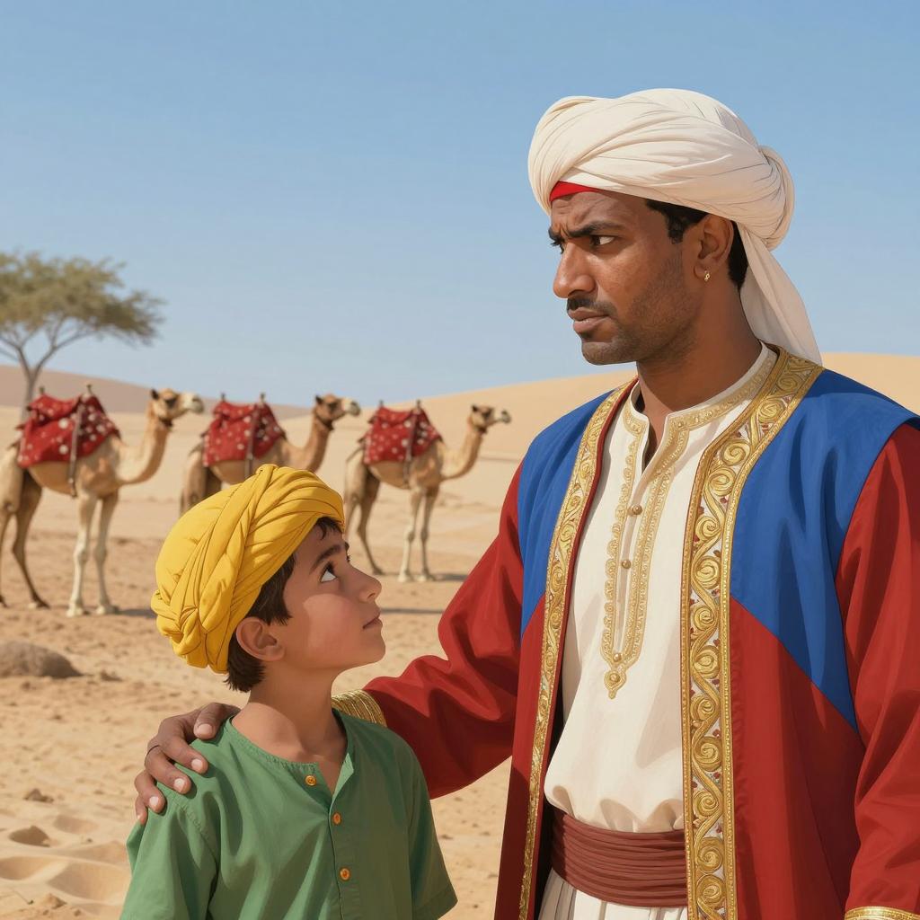 Illustration of a man and boy in a desert. Man with intense expression, white turban, red and blue ornate jacket, and gold trim. Boy with yellow headwrap, green shirt, looking up at man. Three camels with red saddles in background. Clear blue sky, sparse trees. Man's right hand on boy's shoulder. Both facing left.