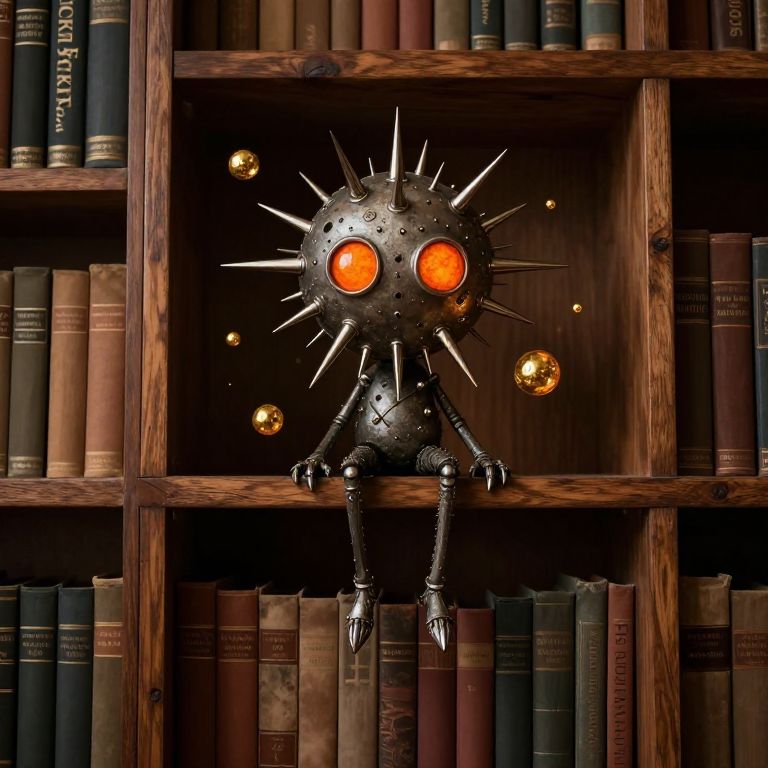 Whimsical figure perched atop a wooden bookshelf in a dimly lit library, its spherical head adorned with numerous metallic spikes and glowing orange eyes, surrounded by floating golden orbs and flanked by rows of neatly arranged books.