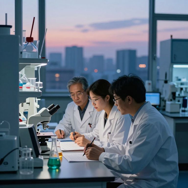 Three Asian scientists, two men and one woman, wearing white lab coats and glasses, are intensely focused on writing notes and discussing in a modern laboratory during twilight. The lab is equipped with microscopes, glass beakers with colorful liquids, and scientific apparatus, while a city skyline is visible through large windows in the background.