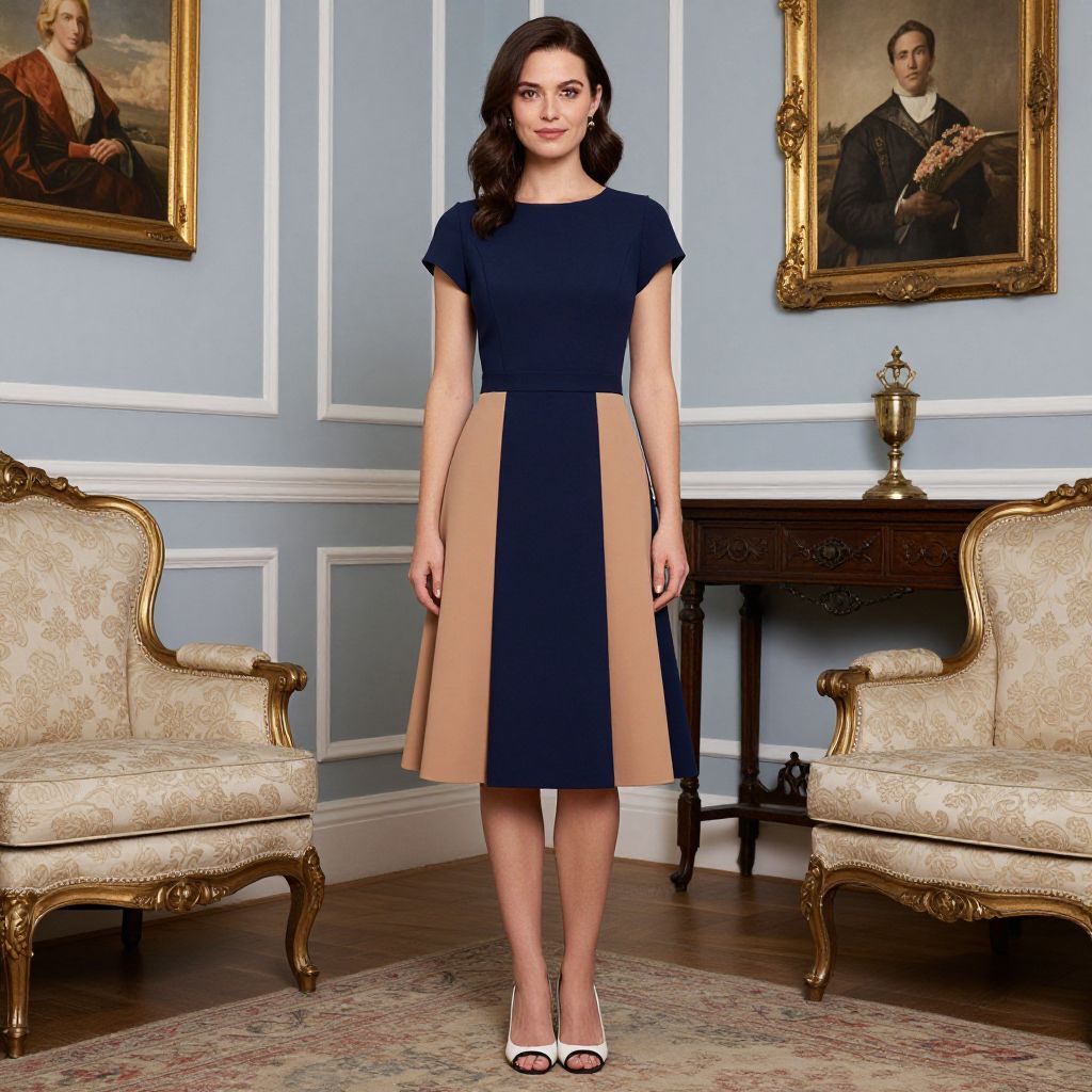 Dress British Themed, woman in a blue and tan dress standing in a room
