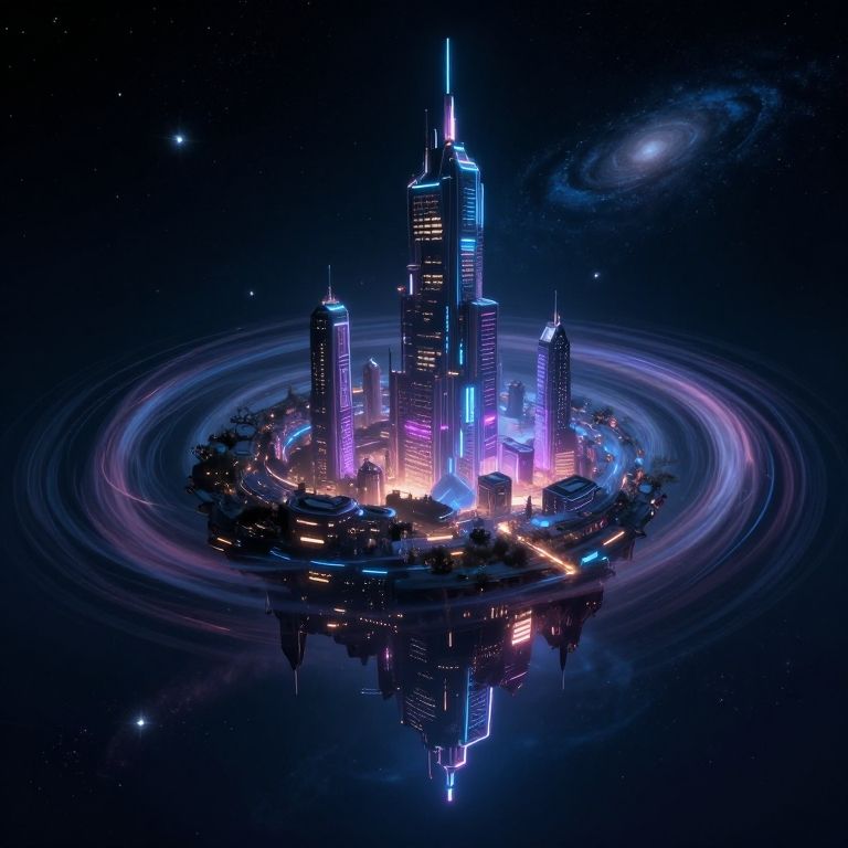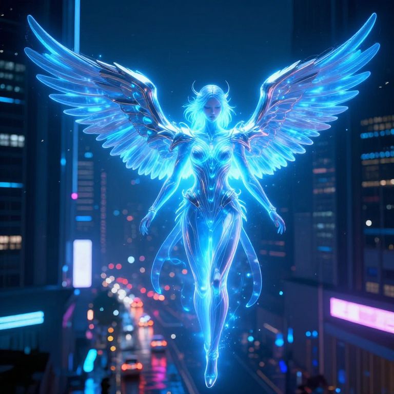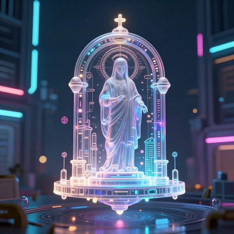 A futuristic tabernaculo made of translucent materials and floating lights in a neon urban setting, combining ancient religious motifs with high-tech elements, reflective surfaces and holographic details, blending spirituality with modern cyberpunk aesthetics.