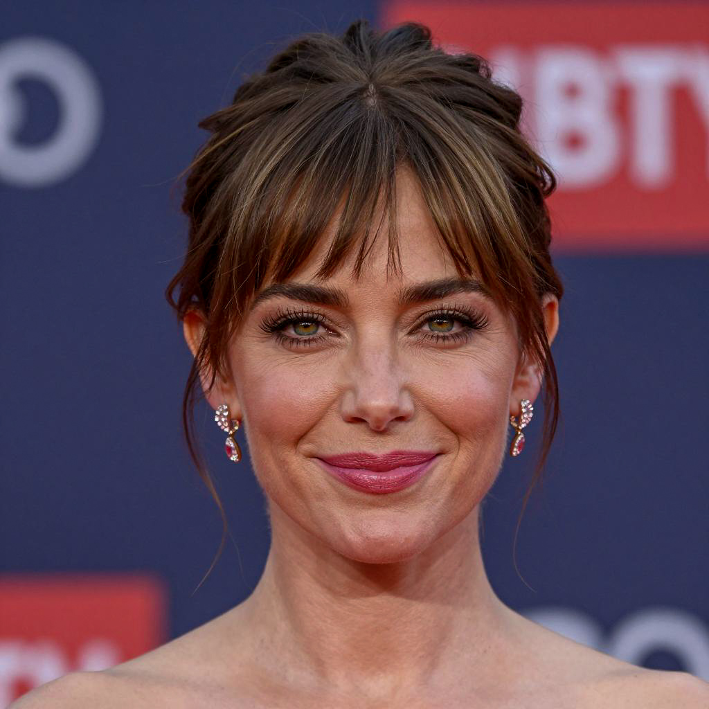 Photograph of a woman with fair skin, brown hair in an updo with bangs, green eyes, wearing pink lipstick, diamond earrings, smiling slightly. Background is blurred with blue and red hues.
