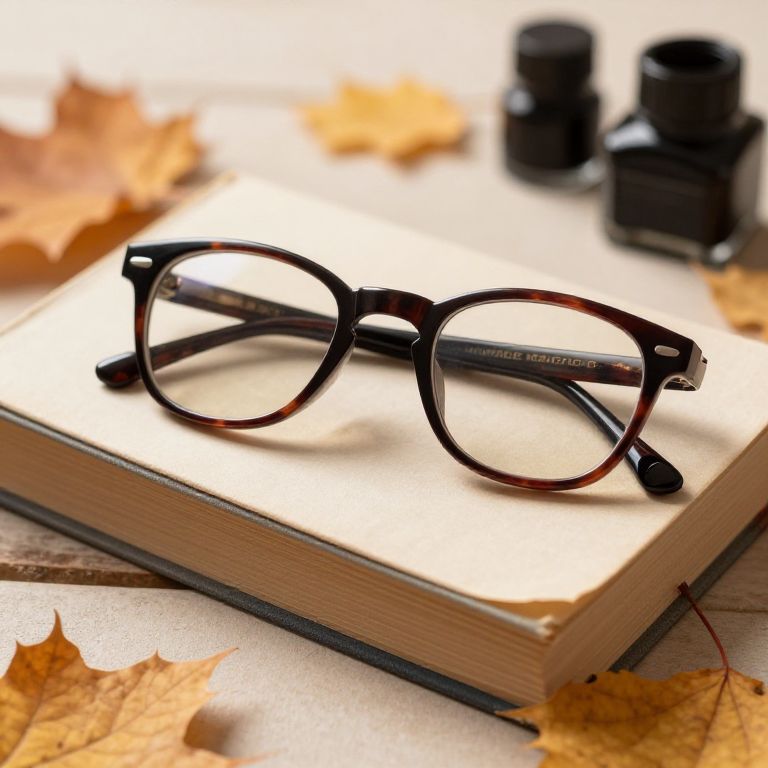 Close-up of dark academia glasses perched on a stack of classic literature, with autumn leaves scattered around, textured paper and ink pots, rustic study vibe