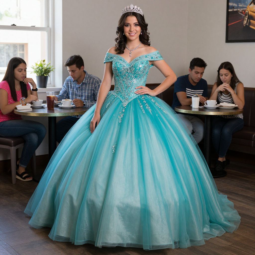 Photograph of a young woman with medium brown skin and dark curly hair, wearing a sparkling silver tiara, an off-shoulder, turquoise, floor-length gown with intricate silver embroidery and a voluminous tulle skirt. She stands confidently in the center of a cozy, sunlit café with wooden floors and large windows. In the background, four casually dressed individuals—two men in shirts and jeans, and two women in casual tops—sit at tables, engaged in conversation. The woman's gown contrasts with the muted brown and beige tones of the café.