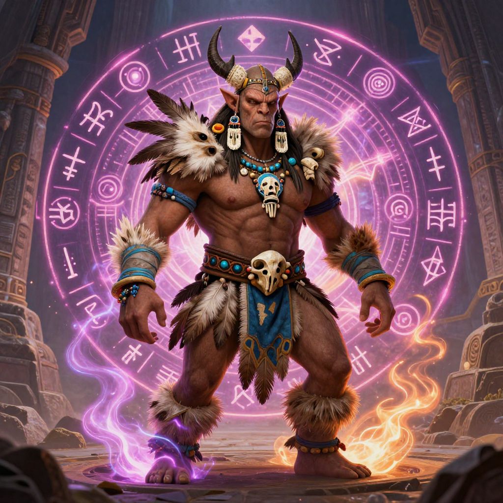 Digital art of muscular, horned demon warrior with fur and skull accessories, standing in fiery, magical, ancient temple circle.