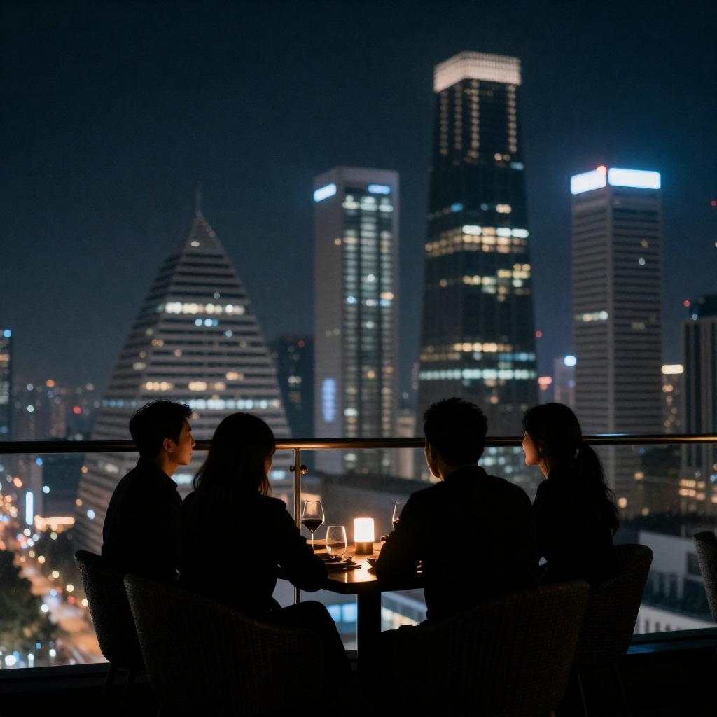Photograph of four silhouetted people sitting at a high-rise restaurant table, facing a nighttime cityscape with illuminated skyscrapers. The table has candles, and the background features a pyramid-shaped building and tall, lit buildings. The scene is dark with blue and white city lights contrasting against the dark figures.