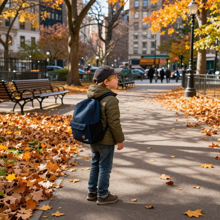 A young boy with curly brown hair and bright green eyes stands in a sunny park, wearing a brown outfit with a yellow hoodie and tan pants. He has a large, colorful backpack on his back and is wearing white sneakers with orange laces. He is smiling confidently, looking toward the horizon as golden sunlight filters through the trees, casting soft shadows on the grass. The scene is vibrant and full of life, capturing a moment of joy and curiosity in a peaceful outdoor setting.