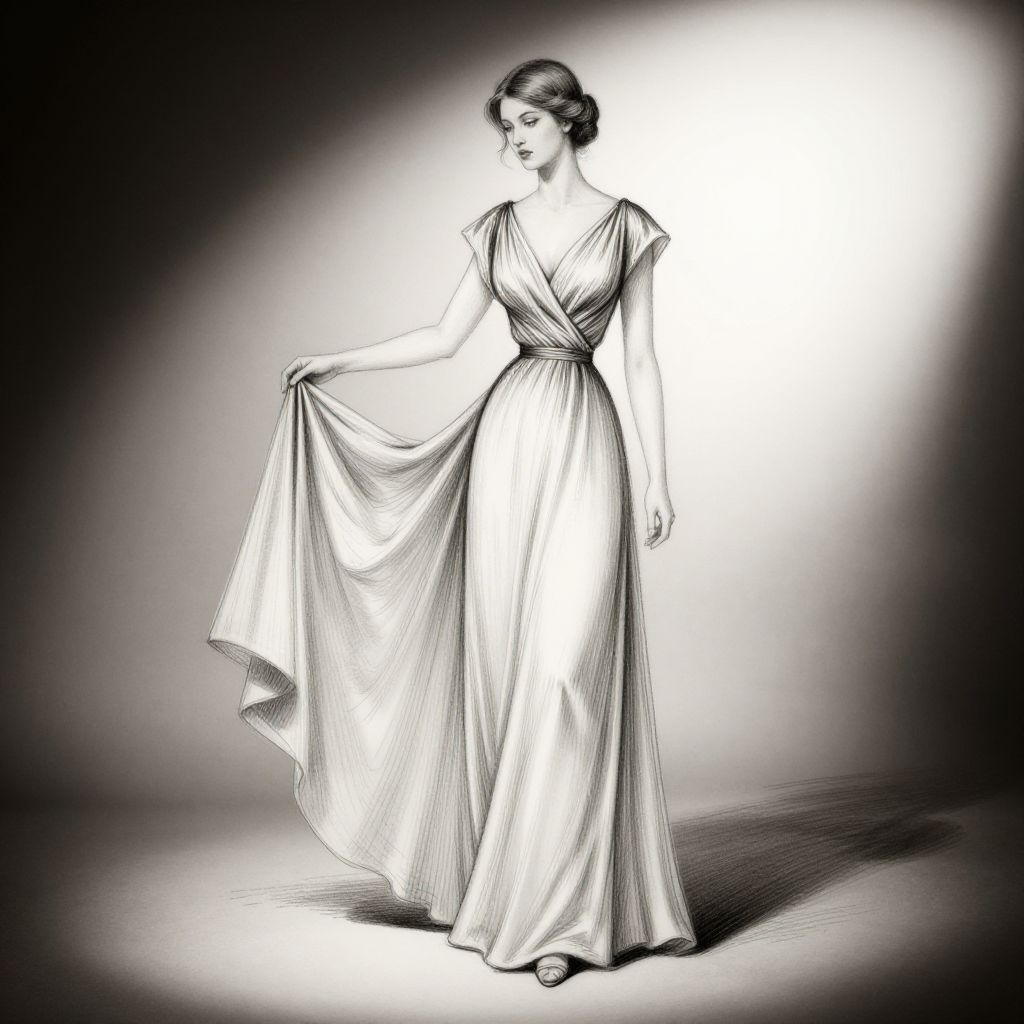 Clothing remove portrayal, vintage fashion sketch of a model removing a flowing dress, monochrome with delicate linework and subtle shading, studio setting with dramatic spotlight and soft shadows, elegant and sophisticated composition