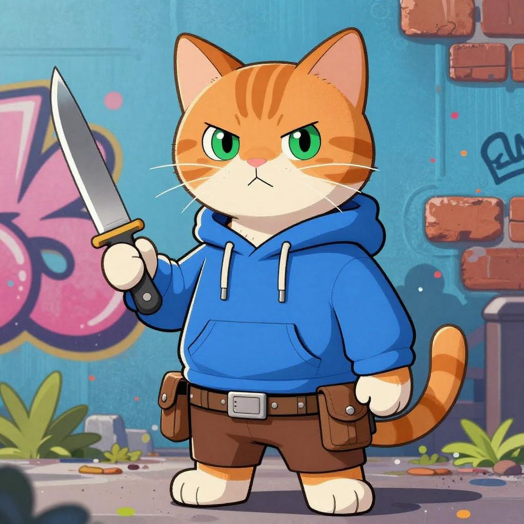 A vibrant, digital cartoon drawing of a large, blue and white tabby cat with intense yellow eyes, holding a large knife in its right paw. The cat wears a tactical vest labeled "RAZOR" and stands against a colorful, graffiti-style background with bright oranges, pinks, and greens. The cat's expression is determined, and the overall style is bold and street-art inspired.