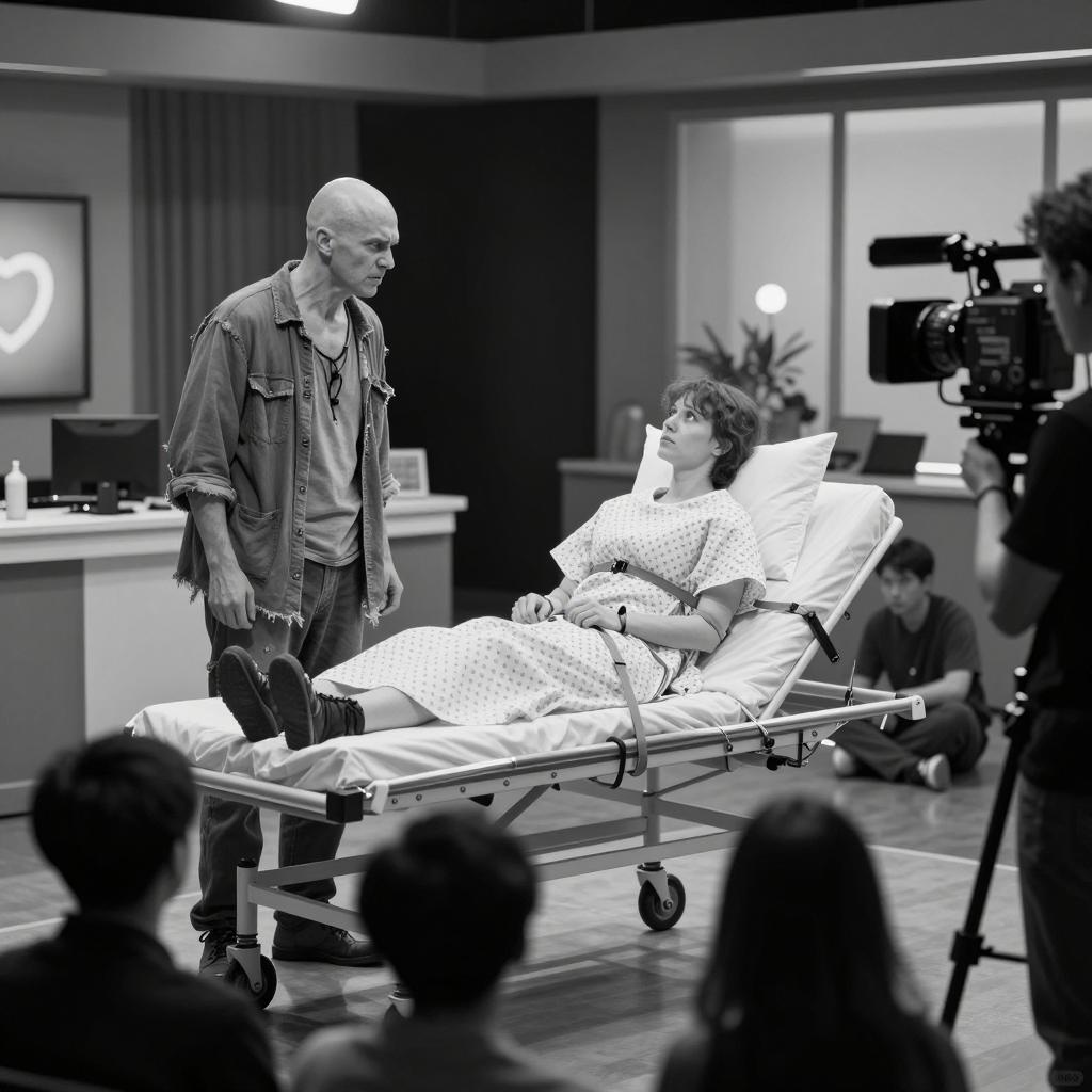 Black and white photograph depicting a dramatic scene inside a TV studio. A bald man with an angry expression, dressed in tattered casual clothes, stands next to a hospital stretcher. A woman wearing a hospital gown lies restrained on the stretcher, looking up at the man. In the background, a person sits on the floor while a camera operator films the scene. Silhouettes of an audience are visible in the foreground.