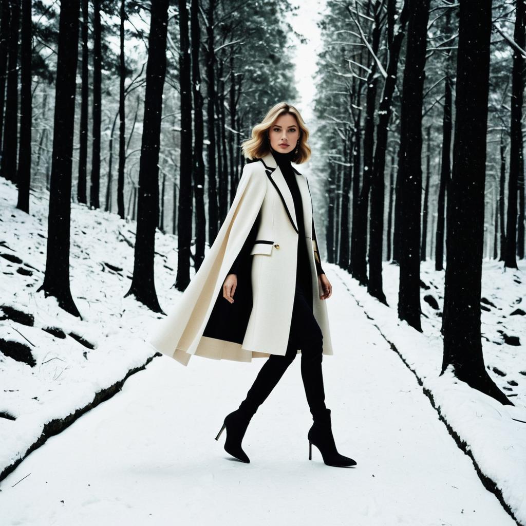 Full-body portrait of a woman wearing a cream-colored wool cape and black tailored midi dress paired with high-heeled black boots. She poses elegantly on a snow-covered forest pathway lined with tall, dark trees. The image features cinematic lighting and sharp focus, emphasizing rich textures and a glossy magazine aesthetic.