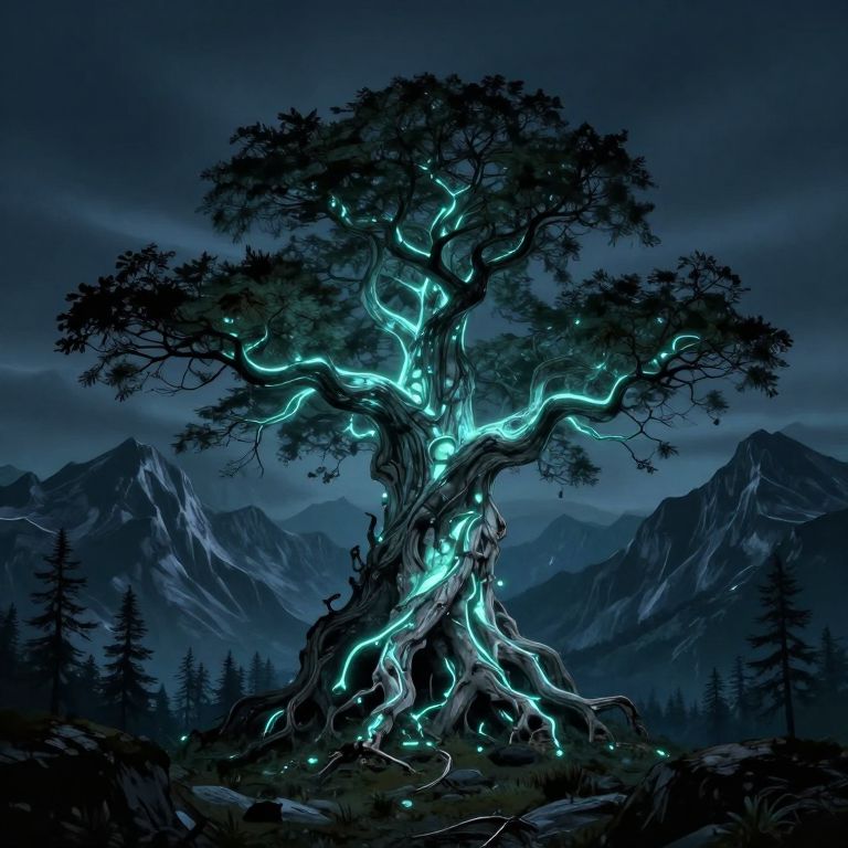 Digital artwork of a glowing, bioluminescent tree with vibrant blue veins in a dark, moonlit forest mountain landscape.