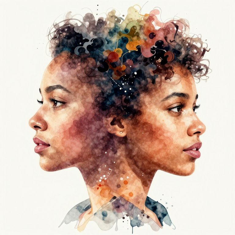 A double exposure facemerge image blending two diverse faces into one harmonious composition, watercolor style with flowing lines and vibrant splashes of color, emphasizing unity and diversity in a balanced, artistic format.