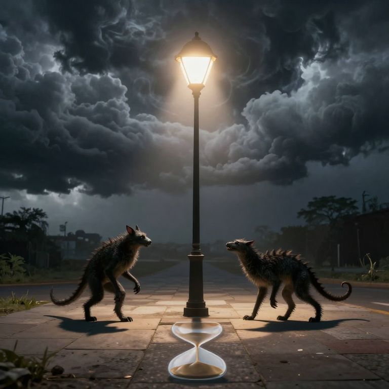 A streetlamp filled with swirling storm clouds casts glowing shadows of impossible creatures wandering a sidewalk made of shifting hourglasses.