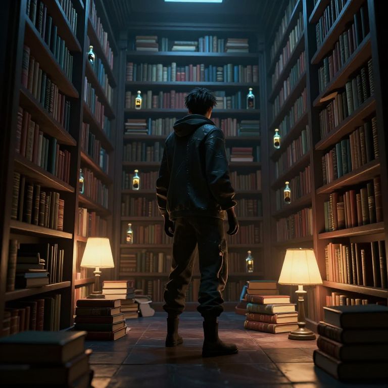 A digital illustration depicts a dimly lit, expansive library with tall bookshelves filled with colorful books on both sides. A lone figure, seen from behind, stands in the center aisle, wearing a dark leather jacket and pants. The figure has short, tousled dark hair. Warm yellow lamps on the floor illuminate stacks of books, casting soft shadows. The library's wooden shelves and tiled floor add a sense of depth and texture. Hanging light bulbs and a small, distant window add ambient light, creating a mysterious, contemplative atmosphere. The overall style is dark and moody, with dramatic lighting and a focus on solitude.