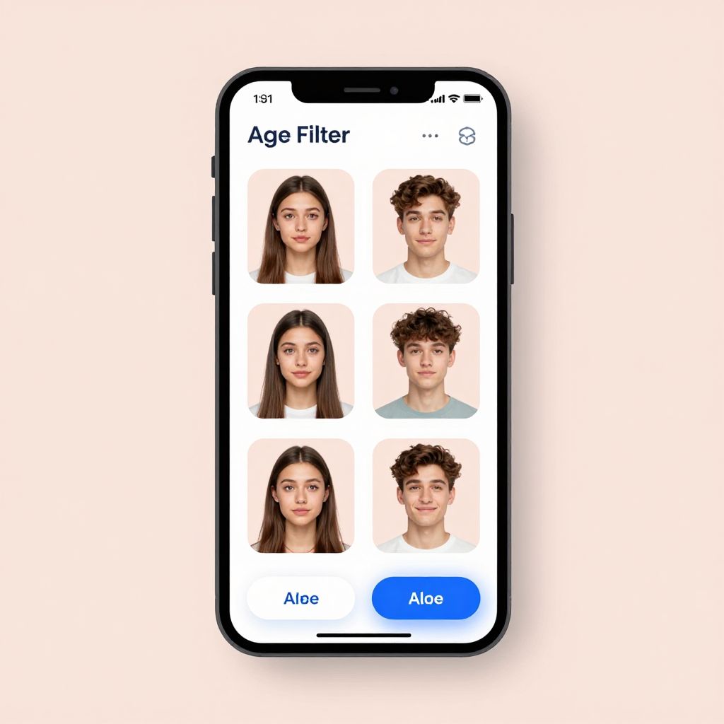 Age filter online free concept with a smartphone screen displaying a user-friendly app, youthful avatars changing appearance based on age inputs, soft pastel colors, clean minimalist background, subtle glow effects highlighting interactive buttons and seamless user experience.