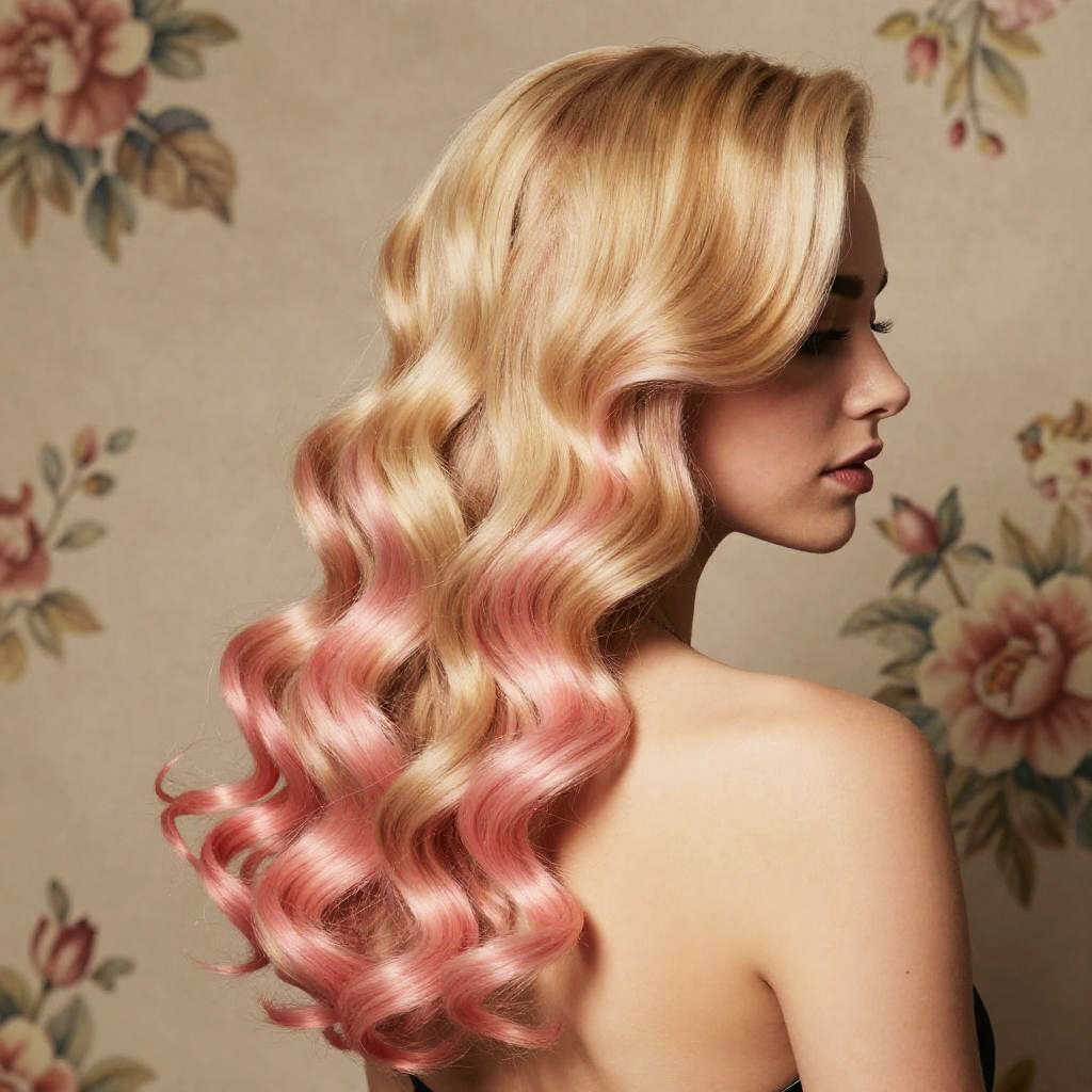 Blonde hair with pink highlights cascading over the shoulders, styled in elegant curls, vintage-inspired background with floral patterns, warm lighting highlighting the colorful strands, graceful and classy vibe, soft shadows