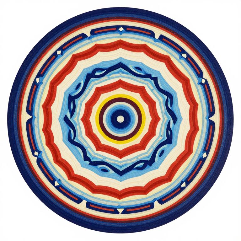 Digital abstract artwork: circular pattern with concentric rings in red, blue, yellow, and white, featuring jagged and smooth edges.
