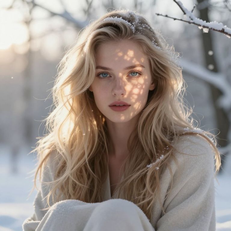 Envision a portrait photograph exuding serene Slavic beauty with porcelain skin, high cheekbones, and piercing blue eyes, set against a frosty winter landscape backdrop. From an intriguing low-angle perspective, her enigmatic gaze directly captivates the viewer, evoking emotions ranging from admiration to curiosity as she sits amidst softly illuminated gentle snowflakes. Warm yet soft lighting enhances this scene, with golden sunlight filtering through bare tree branches and casting intricate shadows across her delicate features and luxurious blonde hair. This ultra-realistic image embodies both ethereal grace and innate strength, drawing viewers into the captivating presence of this stoic enigma.