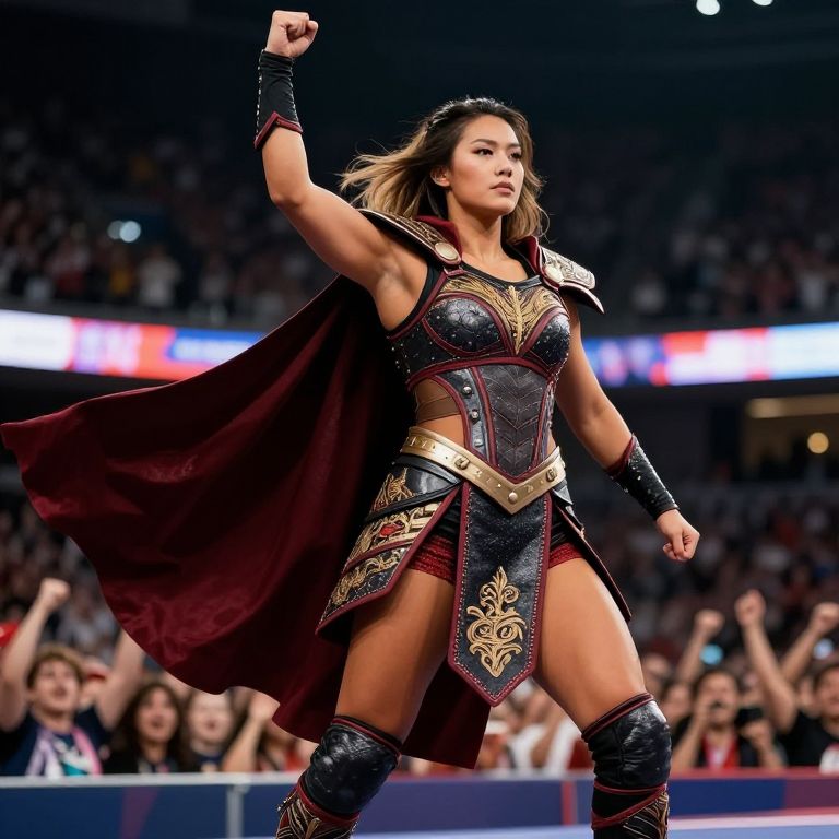 Female wrestler outfit inspired by mythical warriors, featuring armor-like padding, flowing capes, and intricate embroidery, posing heroically in a stadium filled with cheering fans, cinematic lighting and dynamic action pose